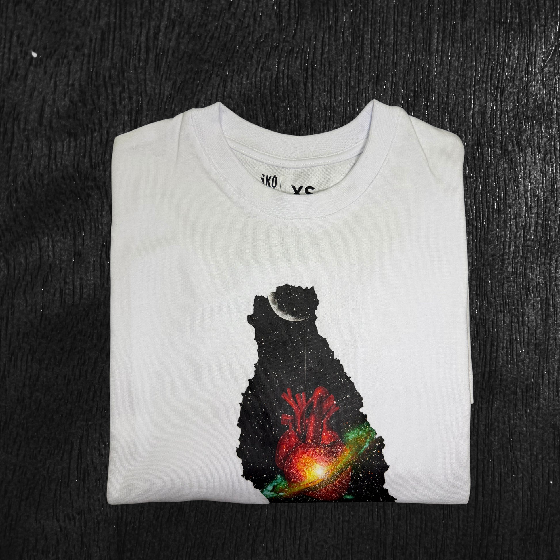 A surreal composition where a human silhouette becomes a universe of stars, illuminated by a radiant heart and framed by moonlight and open water. This design blends emotion and infinity, symbolizing inner worlds, solitude, and the journey of the soul through space and silence.