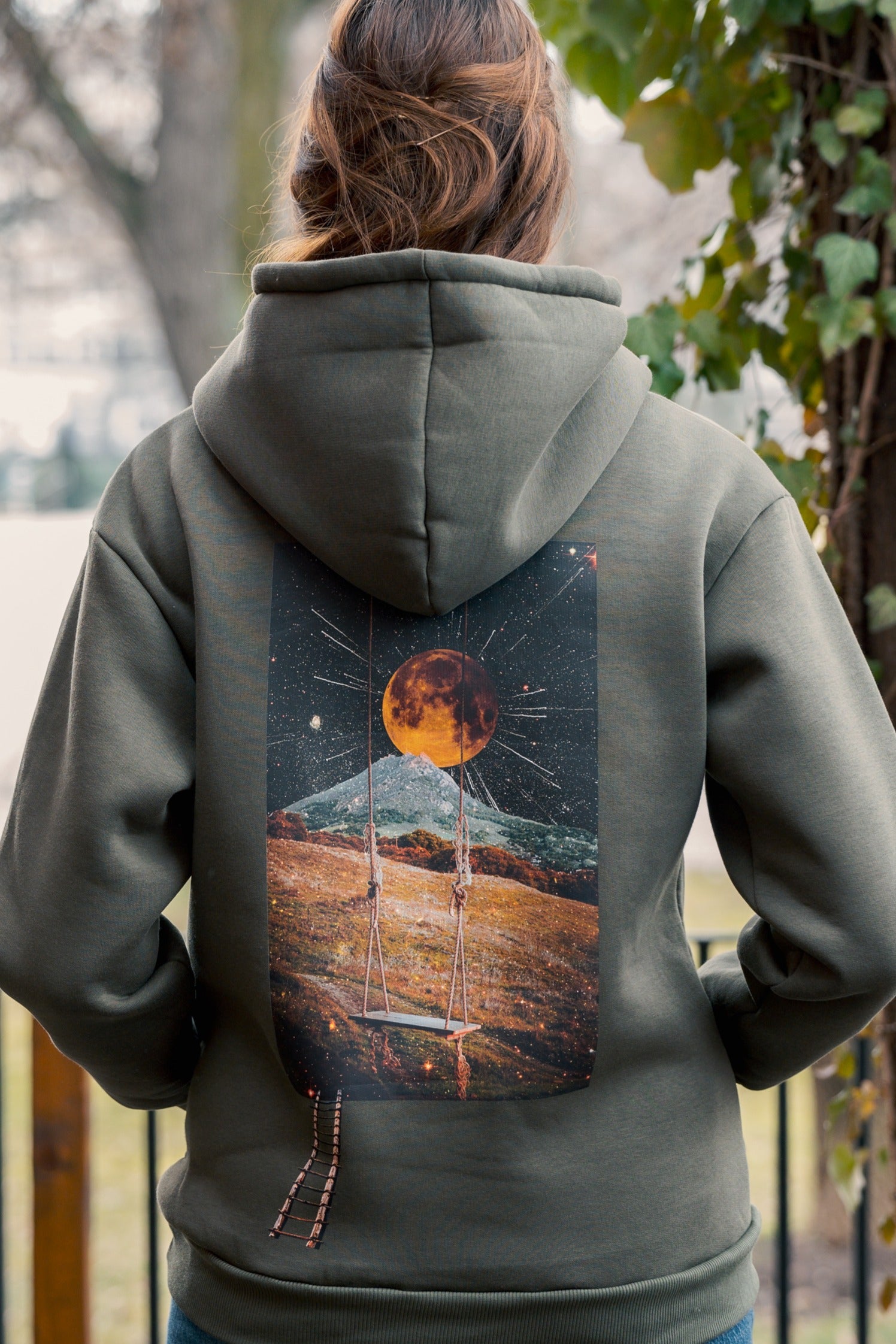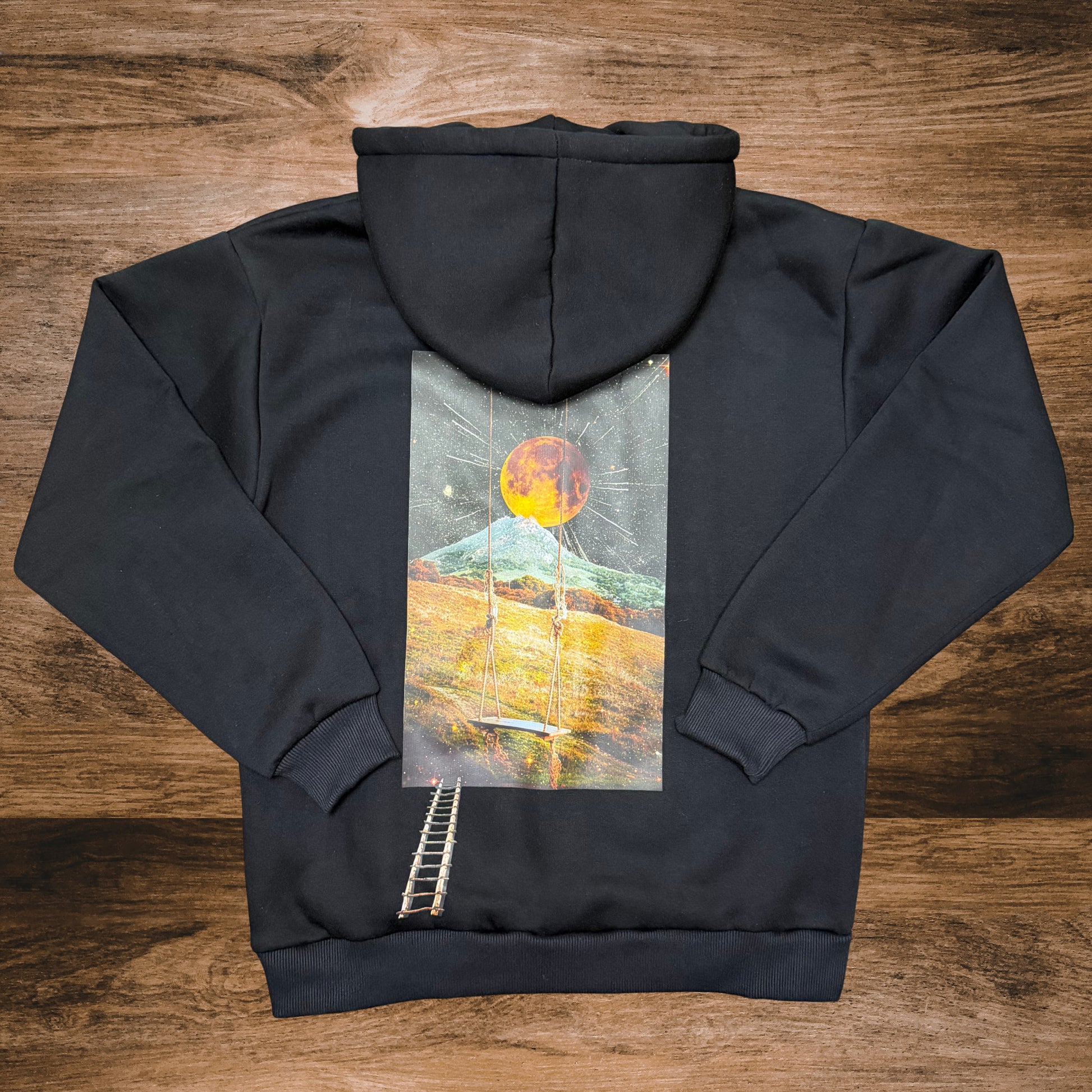 A swing under a glowing moon, set against a starry sky and peaceful hillside, evoking a sense of escape. This dreamy design adds a whimsical touch to any hoodie or t-shirt, blending nature and space for a unique, calming vibe.